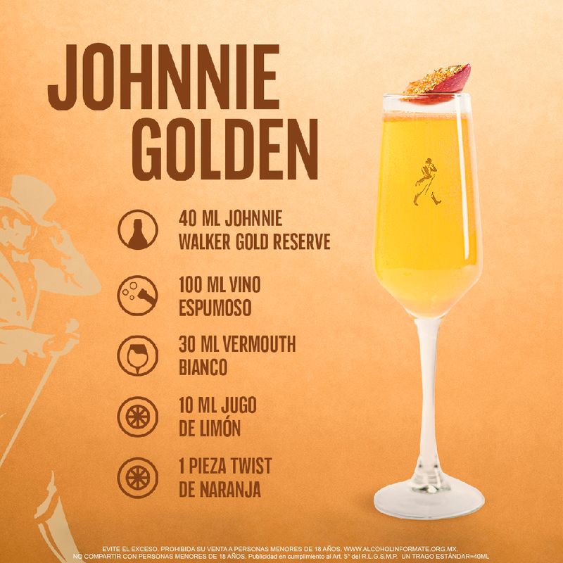 Johnnie Walker Gold Reserve, un whisky con un perfil cremoso y amielado, con notas de madera ahumada, delicioso al paladar. Su dulzor lo vuelven ideal para acompañar quesos suaves, pay de nuez, mousse de chocolate, crème brulèe. Para celebrar con los que nos inspiran a hacer ese siguiente paso atrevido. Exclusivo para mayores de edad. El abuso en el consumo de este producto puede resultar nocivo para la salud. Vista: Oro brillante. Olor: Crema con miel y toques a frutas. Sabor: Suavidad cremosa, con gentiles toques ahumados que se convierten en frutas dulces y tonos a miel.