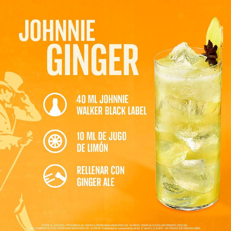 Johnnie Walker Black Label ha sido un referente para todas las mezclas de whiskies existentes, para su creación se utilizan whiskies con un añejamiento mínimo de 12 años provenientes de las 4 regiones de Escocia. Gracias a su perfil profundo puedes acompañarlo de agua mineral, hielo y una rodaja de limón. Exclusivo para mayores de edad. El abuso en el consumo de este producto puede resultar nocivo para la salud. Vista: Ámbar. Olor: Suaves notas a caramelo, naranja, pera, vainilla y ahumado. Sabor: Notas de vainilla, dulce y cáscara de naranja, terminando con toques de humo, malta y turba.